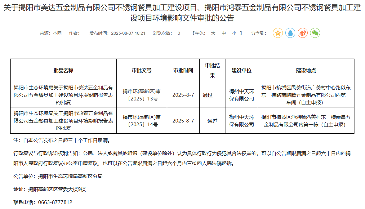據(jù)顯示,這2個(gè)不銹鋼餐具加工建設(shè)項(xiàng)目分別為:陽市美達(dá)五金制品有限公司不銹鋼餐具加工建設(shè)項(xiàng)目、揭陽市鴻泰五金制品有限公司不銹鋼餐具加工建設(shè)項(xiàng)目。